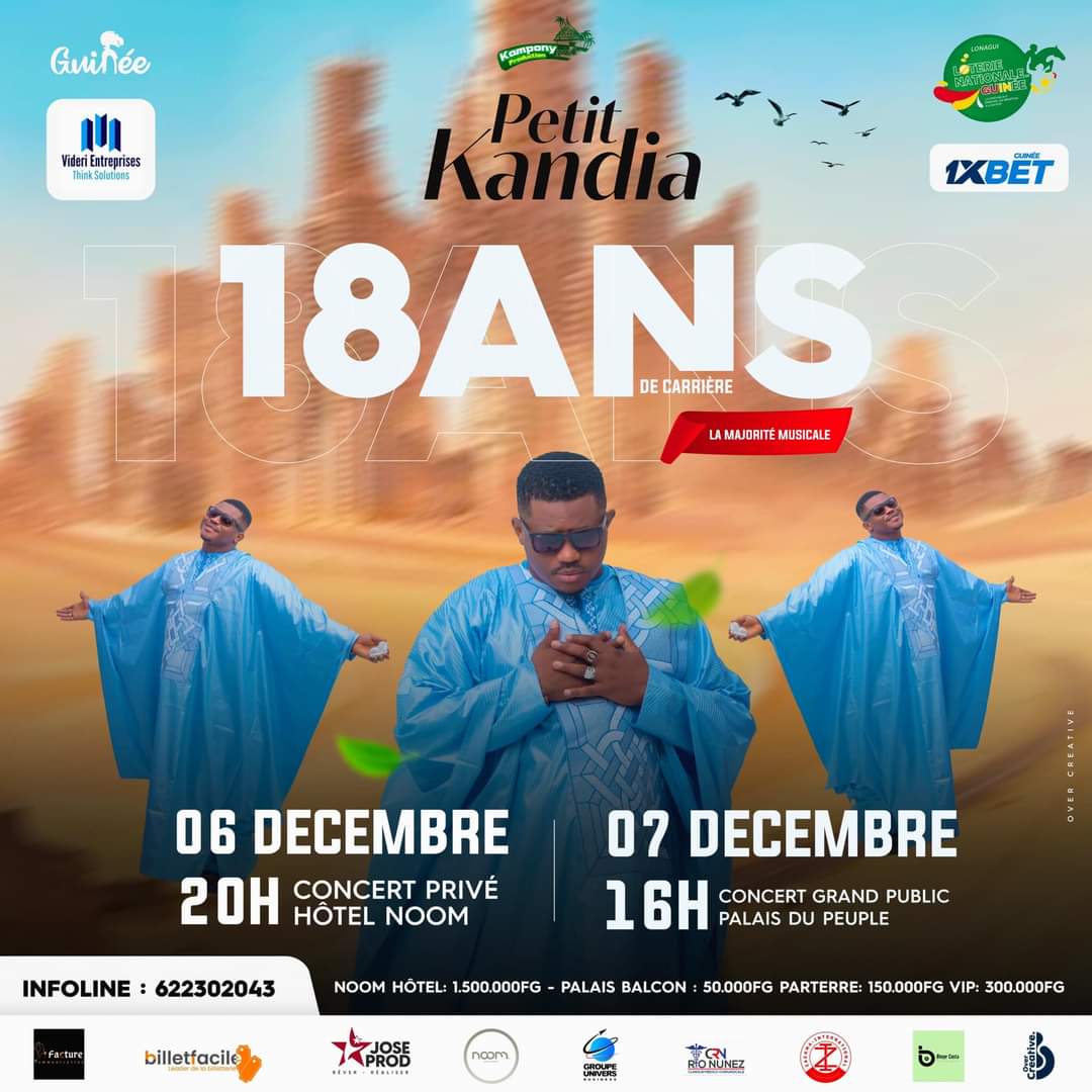 Le 7 décembre au Palais du Peuple : Un grand concert public qui promet d’être le point culminant de cette célébration. Petit Kandia montera sur scène pour interpréter ses plus grands succès et offrir des performances inédites, avec l’objectif de faire vibrer le public comme jamais auparavant. Ce spectacle s’annonce riche en surprises et en moments inoubliables, un hommage vibrant à sa carrière et à son public fidèle.