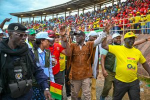 Le point culminant de son séjour s’est déroulé au stade de l’Amitié, où une foule nombreuse l’attendait. Des milliers de citoyens venus de toute la région ont transformé l’événement en une démonstration de force populaire. Danses traditionnelles, chants patriotiques et slogans ont accompagné son arrivée.